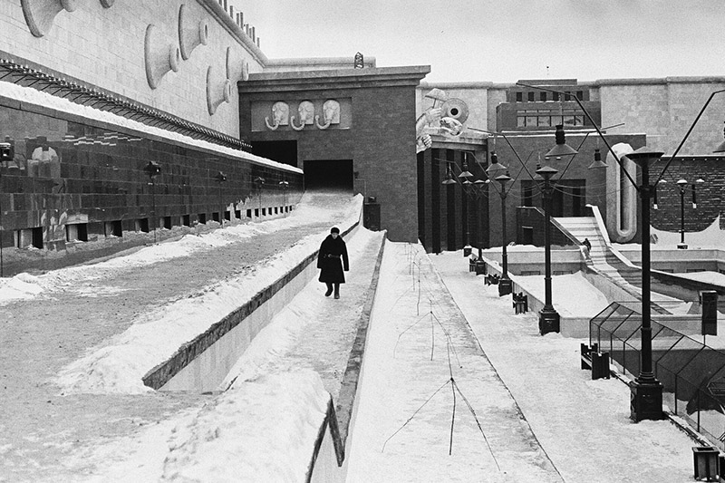 Такое здание могло существовать только в альтернативной художественной реальности Ильи Хржановского. Отель “Оверлук” у Стэнли Кубрика пугал вездесущей симметрией, Институт гипнотизировал сюрреалистическими элементами. Общая площадь сооружения – 6000 квадратных метров, главным украшением Института стали три огромные металлические руки, сжимающие молот, серп и человеческий мозг. Строили здание из фанеры и пенопласта, для виду покрыв пленкой “под мрамор”. Системы отопления и вентиляции не было, что особо чувствовалось зимой. Художники-декораторы в один голос заявляли, что такая временная конструкция не выдержит и обрушится, поэтому к работе привлекли настоящих строителей. Над зданием выделяется наблюдательный пункт, похожий на сторожевую вышку начальника охраны – кабинет режиссера, откуда хорошо просматривался внутренний двор.