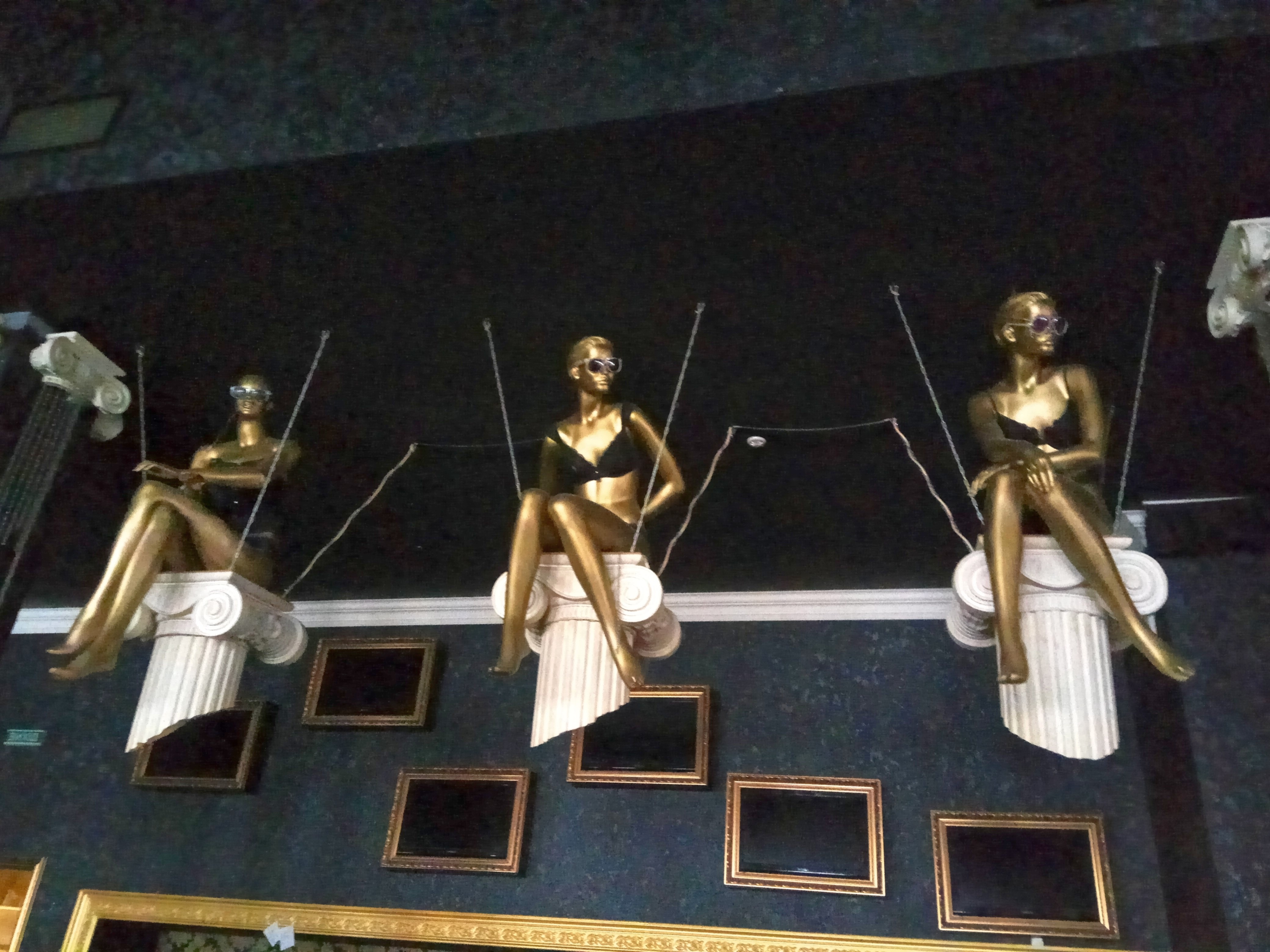 Атмосфера. Двоярусне просторе приміщення клубу оформлено в чорно-золотих тонах. Зі стелі на декорованих гойдалках звисають ростові жіночі фігури у окулярах та дорогій білизні. Сцена розташована посередині зали, оснащена 12 кіловатами звуку і сучасним світловим обладнанням.